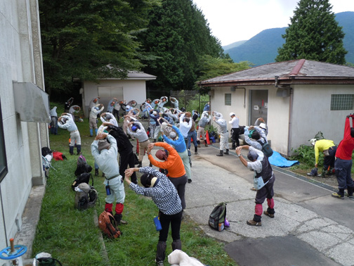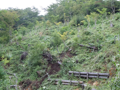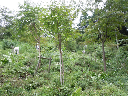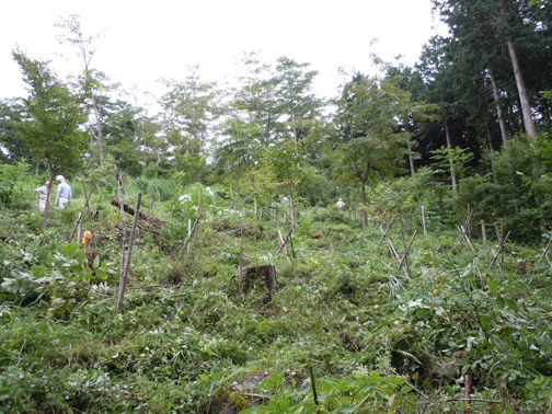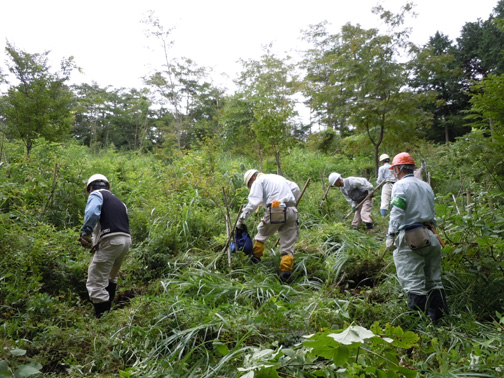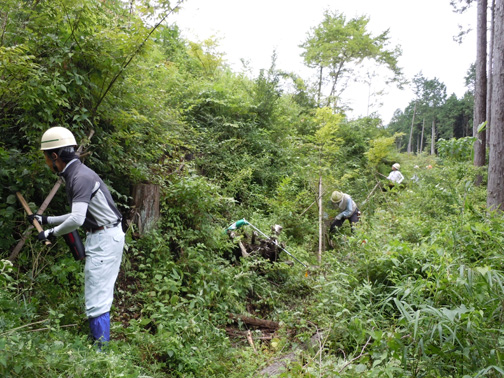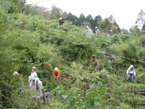 活動報告小田原駅前以外は予想以上に道路が空いていた。 現地は降車場所から徒歩5、6分と地理的条件にも恵まれた個所である。浄水センター職員の話では前日まで雨が降っていて作業が心配されたが、当日は曇天となり太陽が時々顔を出す程度で気温も高くなくこの時期にしては作業をしやすい状態でした。 風倒木処理の根株や処理枝で足場も悪く、また野バラ類や山椒、タラの木などの刺類が多く繁茂しているので参加者の皆さんも刈るのに苦労をしていました。しかし、参加者の皆さんの努力により熱中症もなく一部を除き作業を終了することができました。 (tori) 〔一般参加者数 45名〕
