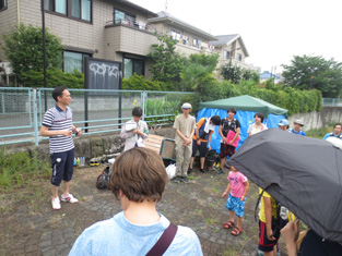 学生スタッフによる投網の実演では、投網を投げるお兄さん達の姿に子ども達は目を輝かせていました。見学後は各自バケツとタモ網を持って川に入り、各々生き物をタモ網で捕まえてはバケツに入れていました。