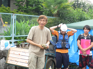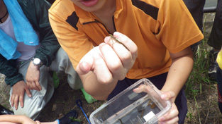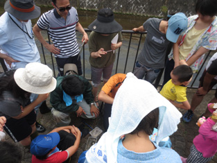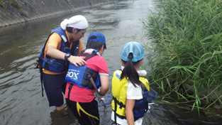 大人の手を借りて大きい石をひっくり返し、下に隠れている生き物を捕まえたり、川に生えている葦の根元をタモ網ですくったりと、大人も子ども夢中になって生き物を探していました。 捕まえた生き物たちは、学生スタッフの手で透明な水槽に入れられ、説明を受けました。
