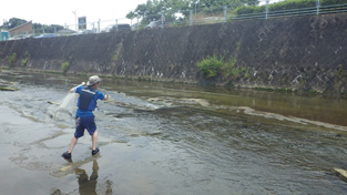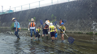 市街地の中にある鶴見川浅瀬で生き物をとって観察しましょう。対象は小学3年生以上です。大人の方だけでも参加できます。